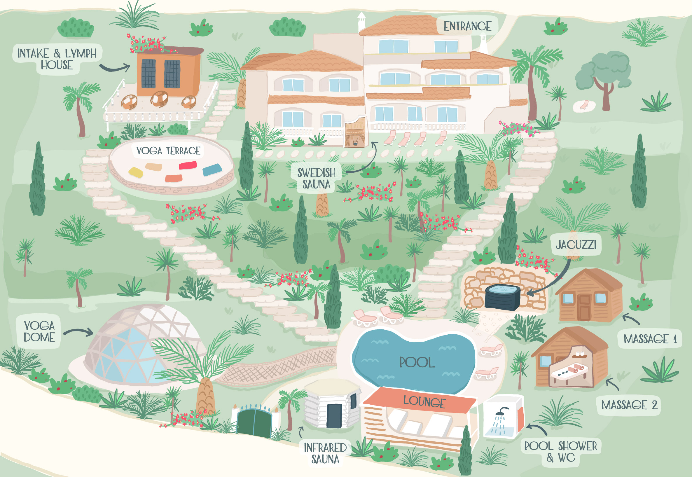 The Casa is spacious, cozy, and beautifully designed, featuring a swimming pool, two saunas (Swedish and infrared), three massage cabins, a jacuzzi, a yoga deck, and an air-conditioned/heated Yoga Dome. It’s an ideal environment for yoga, meditation, quiet walks, or simply unwinding by the pool. With a range of massage and beauty treatments available, you’ll feel as if you’ve checked into a boutique spa resort for the week.